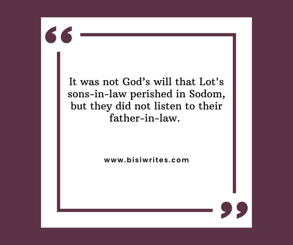 There is no doubt that had Lot’s sons-in-law listened to their father-in-law, not only would they have saved their own lives, but also saved their wives from having children by their own father.